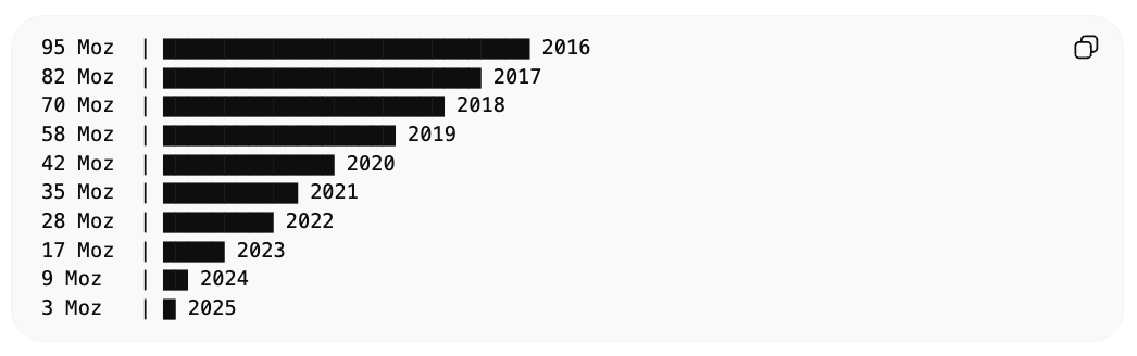 Over the last decade, major gold discoveries have continued to decline as mining companies face rising costs, deeper excavation requirements, and fewer economically viable reserves. Industry analysts have noted that large-scale discoveries are becoming increasingly rare, despite billions being invested into exploration globally.